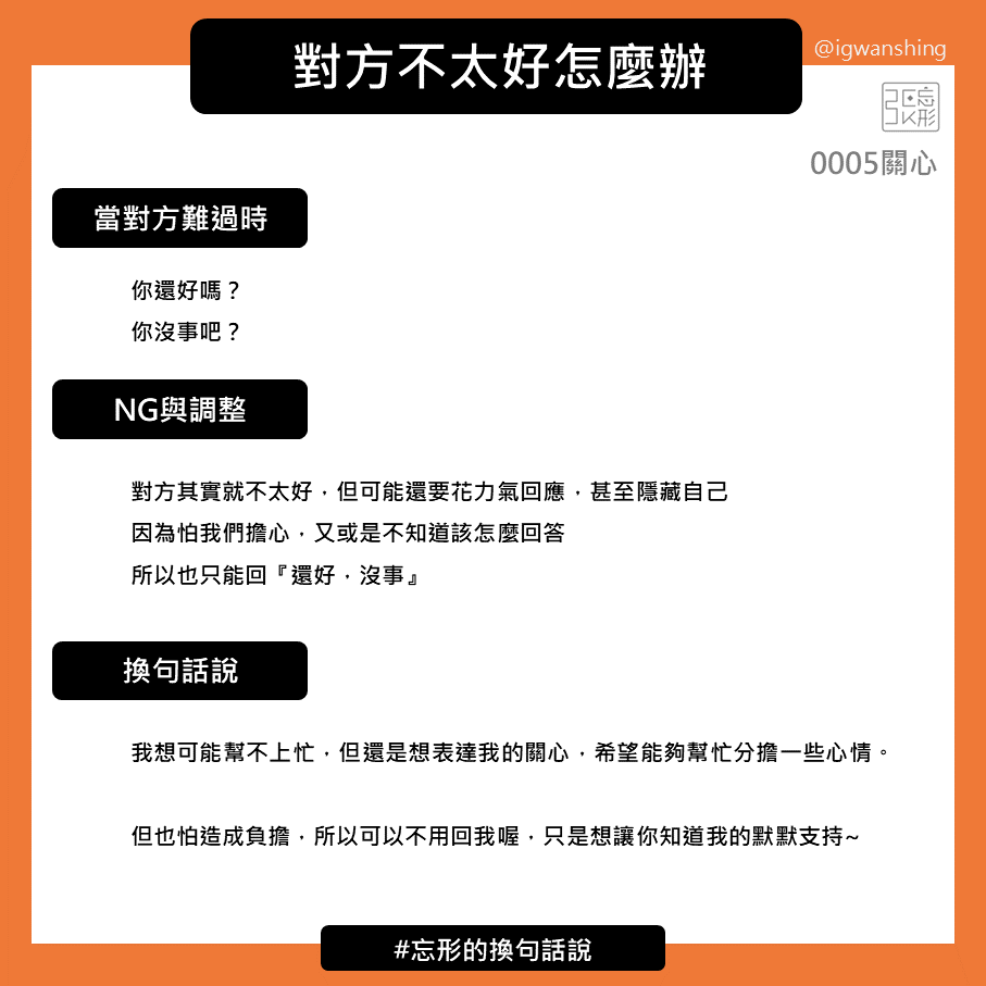 然而我們卻可能忘記每說一次,除了時間之外,更可能還會消耗情緒。因此既然要關心,也確定自己幫不上忙,不如就說明關心的來意,並且讓對方知道可以不需要回應,只需要收到心意就好。